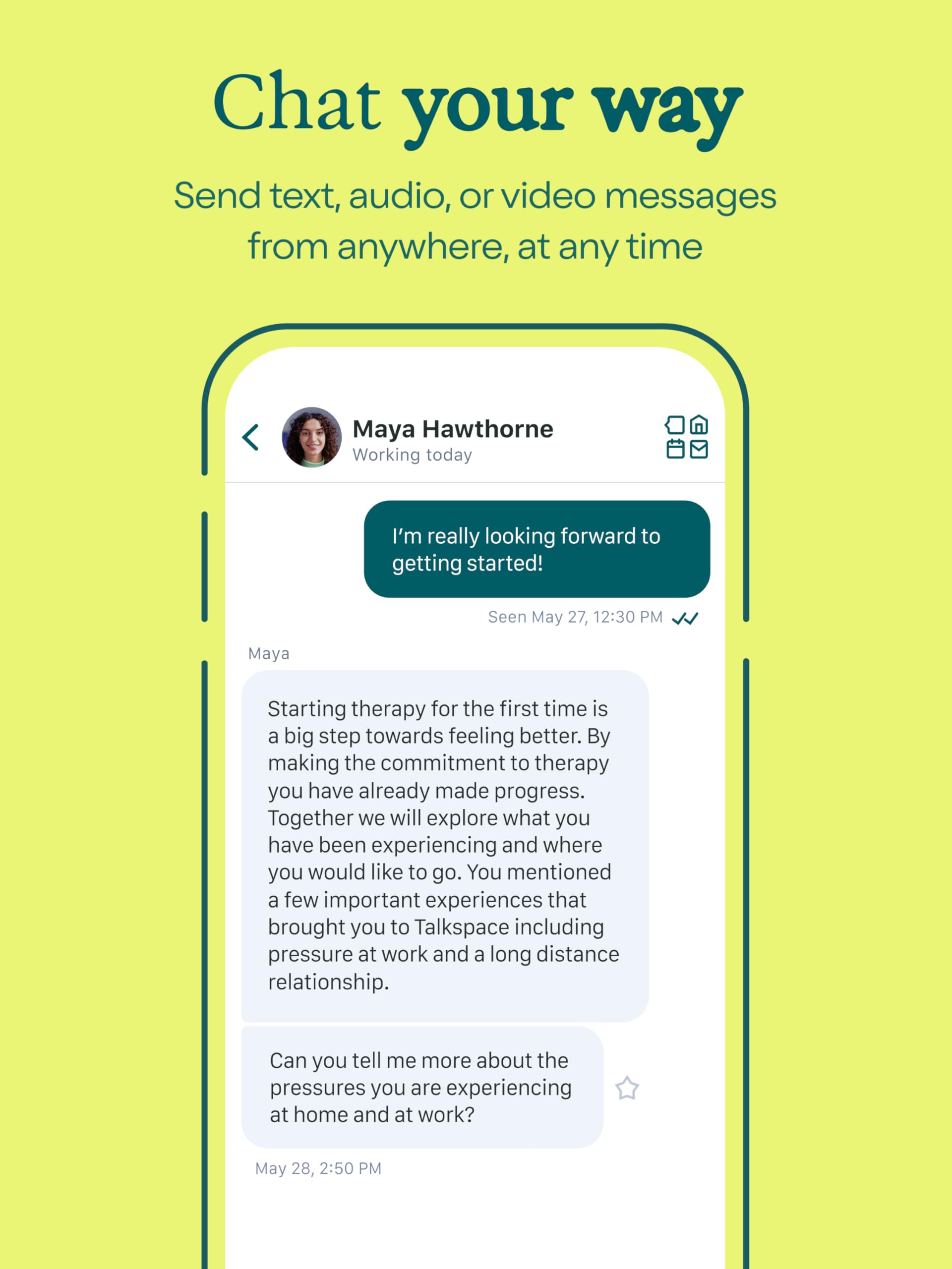 | Unlimited therapist messaging | Send your therapist as many text, voice, or video messages as you'd like and they'll reply 5 days per week. |